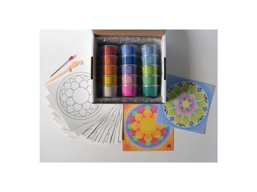 Sada obsahuje 12 samolepicích madalek velikosti 10x10cm, 15 barvev písku, špendlík k odlupování dílků samolepky , dřívko pro dotváření detailů.