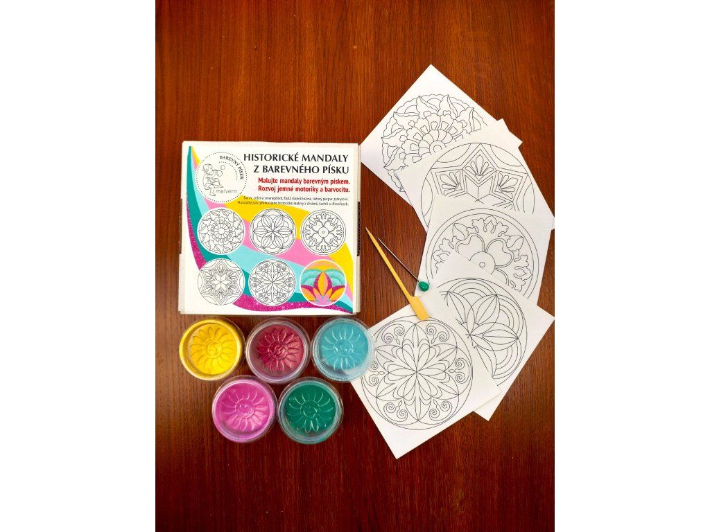 Sada obsahuje 5 samolepicích madalek velikosti 10x10cm, čtyři barvy písku, třpytku, špendlík k odlupování dílků samolepky , dřívko pro dotváření detailů.
